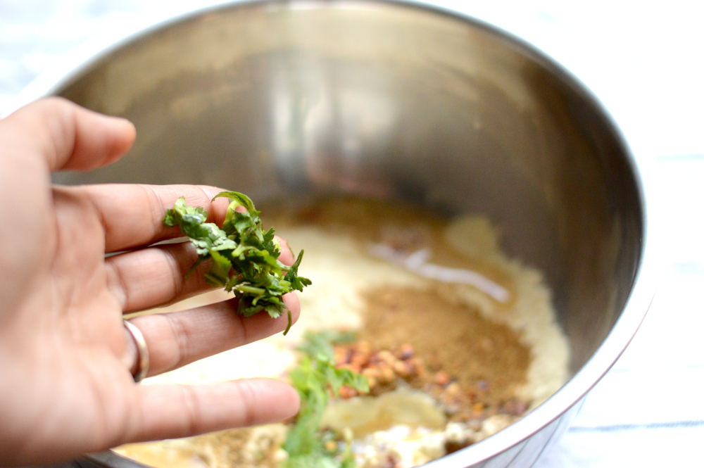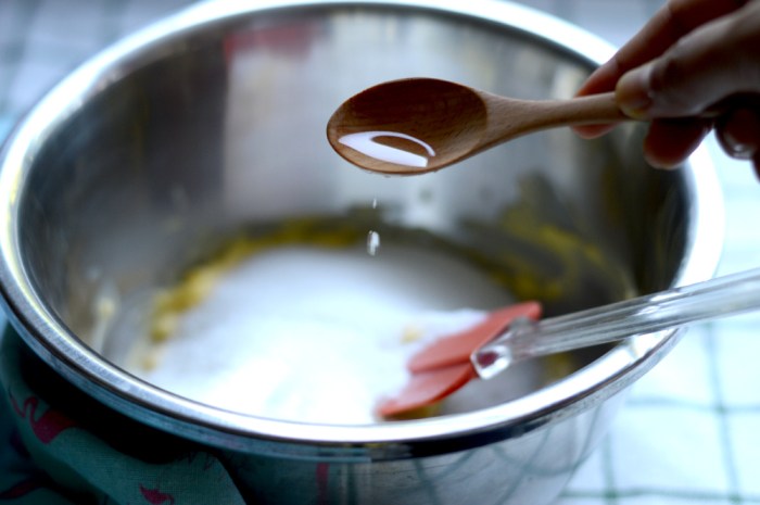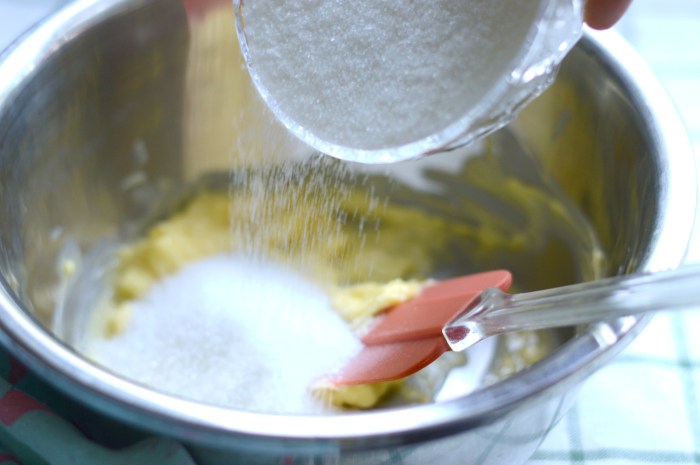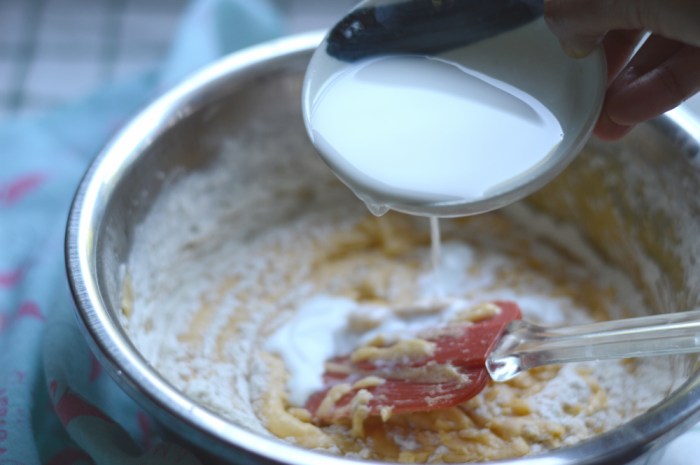 followed by four and baking powder. Mix enough to incorporate the flour into the batter without overmixing it.