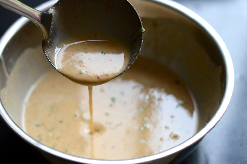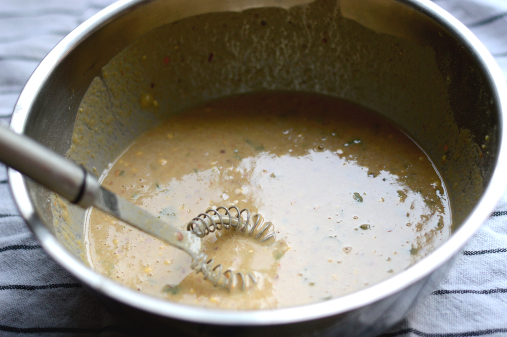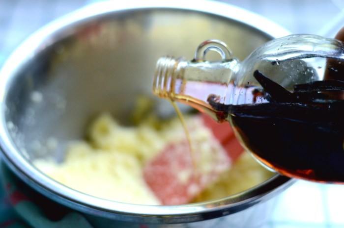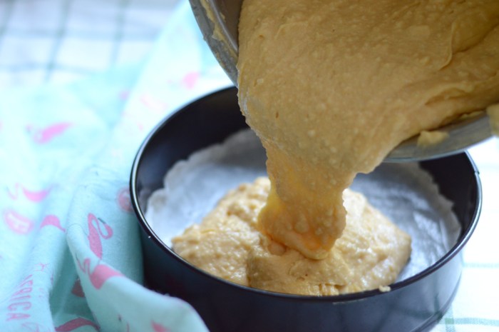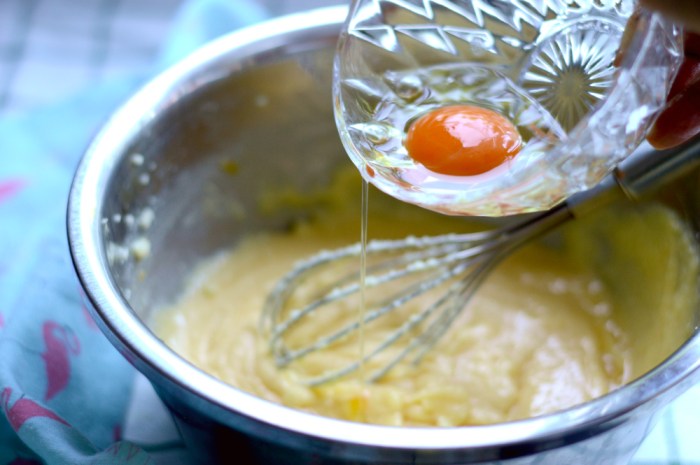 Crack in the eggs and mix into the batter until the eggs are well incorporated. It will take a few minutes but it’s worth it. This makes the cake fluffier than if you were to mix it half-heartedly.
