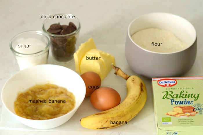 The ingredients are few. Bananas, eggs, butter, flour, chocolate, baking powder and sugar