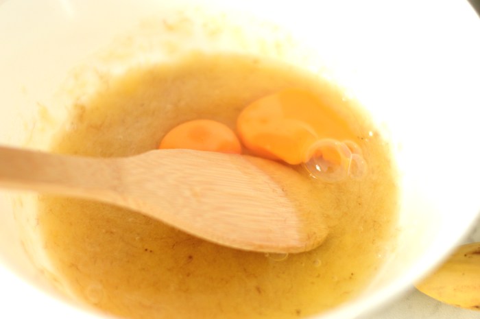 Mash one banana in a large mixing bowl and add the sugar. Beat until the sugar is well mixed and crack in the eggs and mix for a few minutes. The eggs should be well incorporated into the batter before adding the melted butter. Stir briefly before adding in the flour and baking powder.