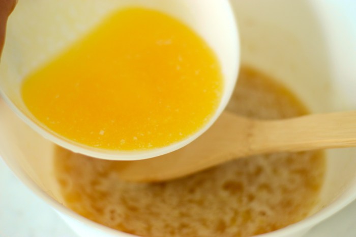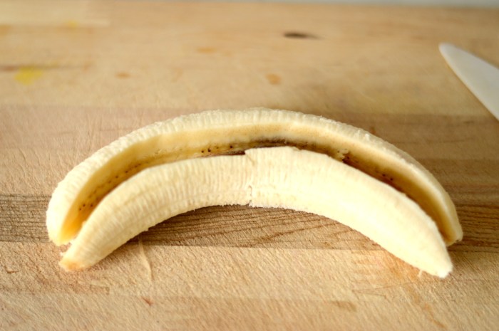 Melt the butter and let cool. Halve one banana lengthwise and reserve for later.