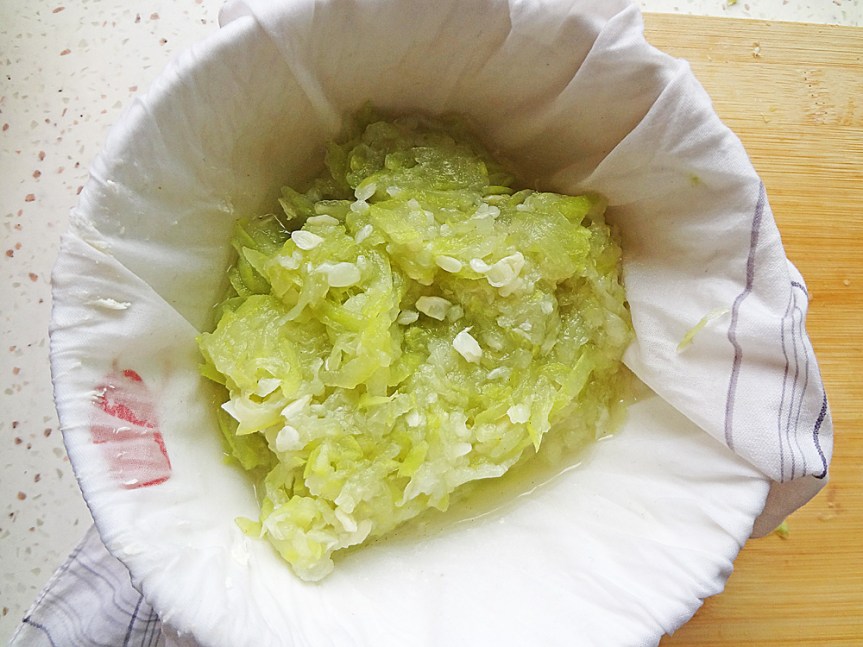 After 10 minutes you’ll see all this water accumulated in your pan or well in my case. We need to separate that- take a cheesecloth or any fine cloth and drain, squeeze it using your hands, but please let this stuff cool down first or wear gloves. squeeze out all the water- any moisture ad it will refuse to bind completely, and we don’t want to fry a mess of green mass.