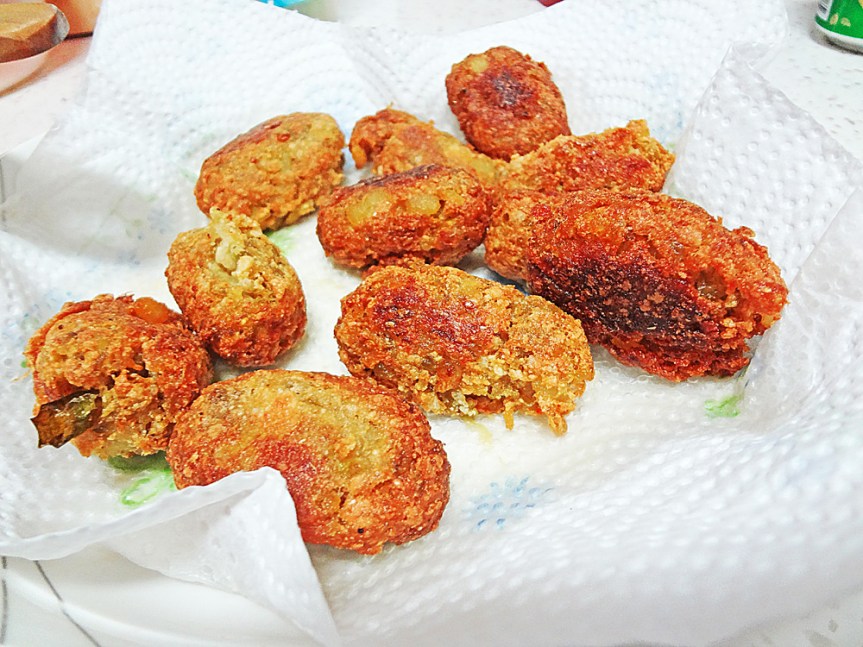 Scoop out small bits of this mixture and using your hands roll them into balls or these cylindrical little babies. I always make them this way cuz my mom always made them so, and they taste amazing and I miss my mom now…
