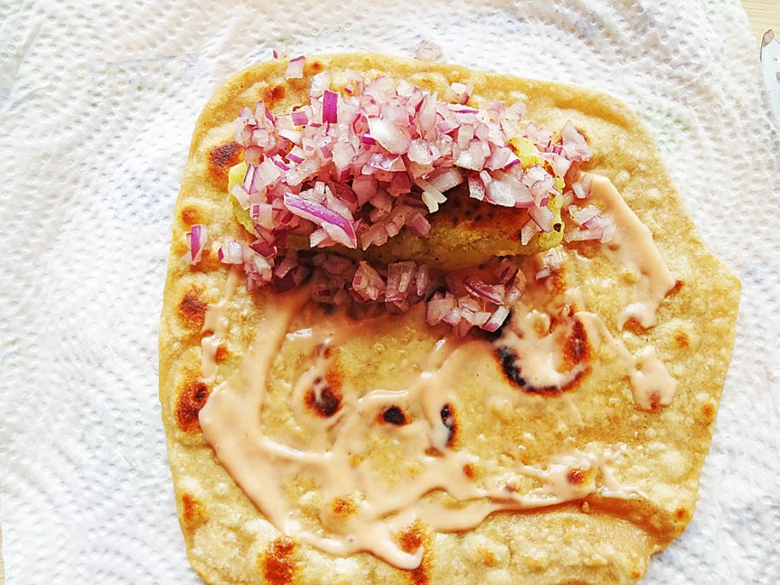 In my wraps I have used potato patties as a filling- you can find the recipe here but since it’s a wrap and anything goes, you can add in anything, kebabs, sausages, fried vegetables, eggs.. anything.