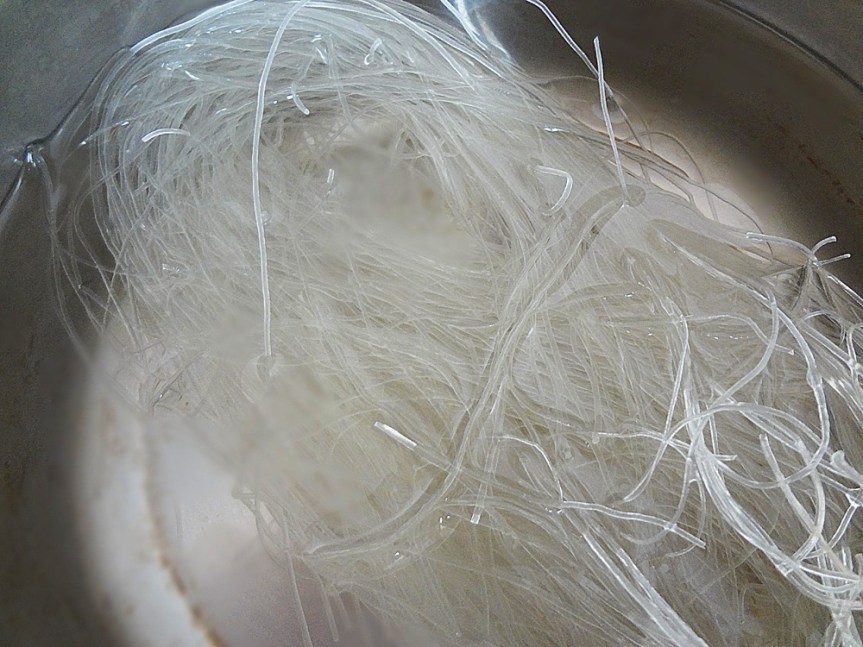 Now the best part of these rice noodles (vermicelli) is that there’s no fuss about boiling or anything. You just need to soak them in some water for 15 minutes max and they’re done. I am using room temperature water here.