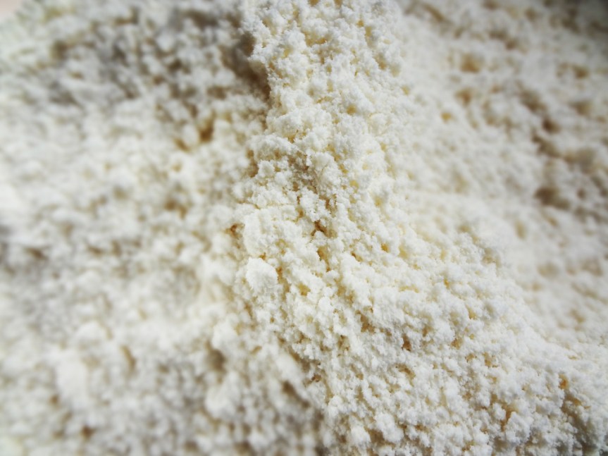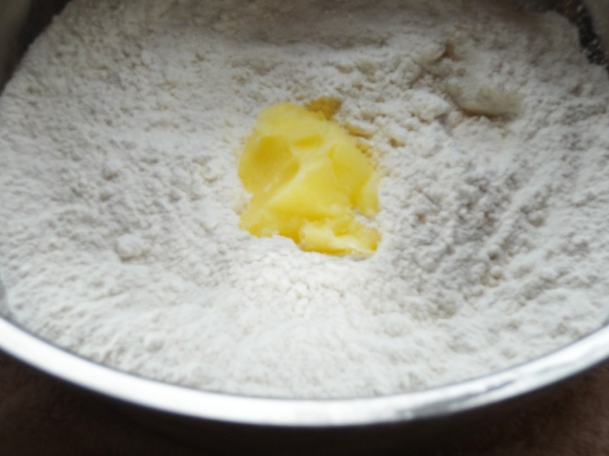 one cup of flour, 1 tsp salt, 1/2 tsp baking soda and a fat knob of vegetable fat/butter.. this here is 2 tbsp of fat in 1 cup flour