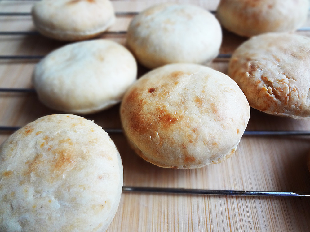 I baked them at 200℃ for not more than 12-15 minutes, and they didn’t puff up too much, since they’re tiny and made of thinner discs, but they rose up enough to slice them & slather with jam.