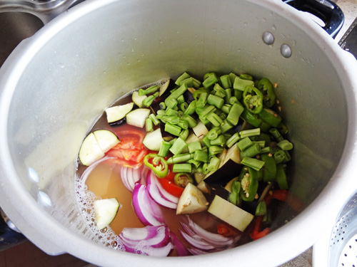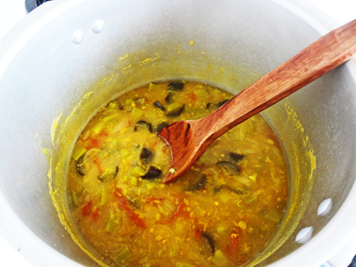 In a deep pan mix the chopped vegetables, onion, tomato, water, asofoetida, salt and turmeric. Cook them on medium flame for about 35-40 minutes (covered) or until the lentils are cooked and the vegetables mushy.