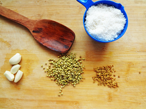 Now for part 2. and this is what makes this dish truly South Indian. These spices, sort of form the soul of this food. I have here 4 cloves of garlic. 1 tbsp of coriander seeds, 2 tsps fenugreek seeds, 1/2 cup shredded coconut.- If miraculously you happen to have fresh coconut, then nothing like it.