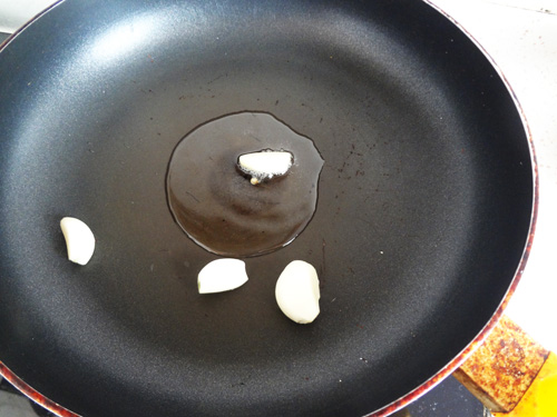 Into a very hot tablespoon of oil, add in the garlic cloves