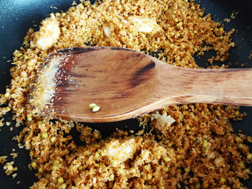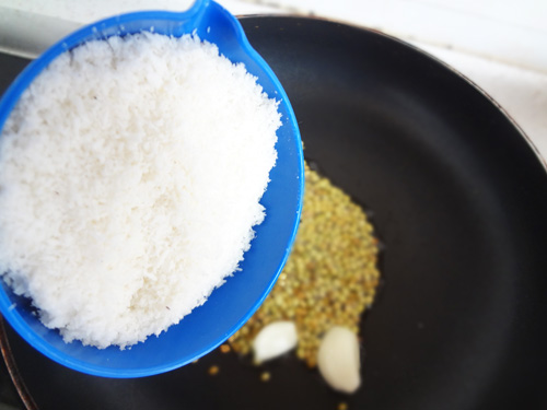 In a separate pan, heat the oil, tip in the garlic, fenugreek and coriander seeds, coconut. Fry until it’s all golden brown. Once these spices are golden and fragrant, blend them with a tbsp of water. Add crushed chillies as per taste- they’re completely optional.