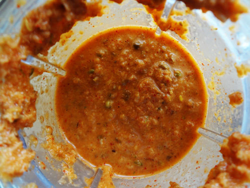 Now if you wish to make your dish more spicy, add in some ground red chillies (completely optional). usually one adds dried red chillies before blending, but since my husband is not a friend of the spicy stuff, I like to do this to control the chilli.
