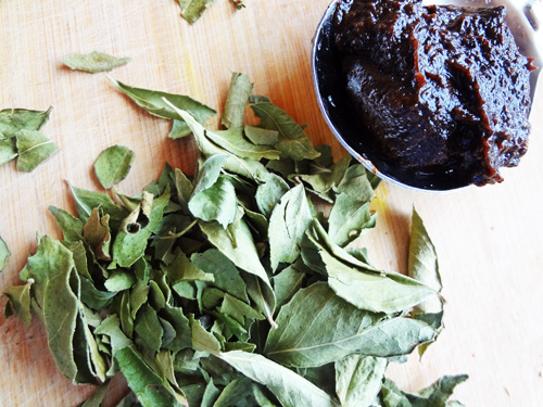 The last in line of taste and aromatics. I have some curry leaves. It’s a handful really. But in case you have the fresh stuff 8-10 leaves will do. Also 1 tbsp of tamarind paste. This tamarind gives the sambhar its distinct subtly sour taste.
