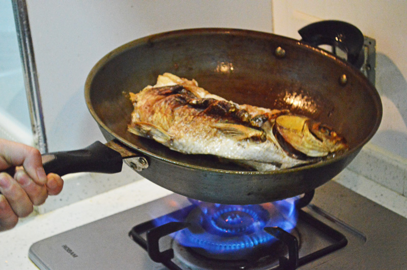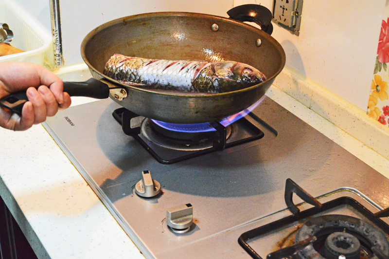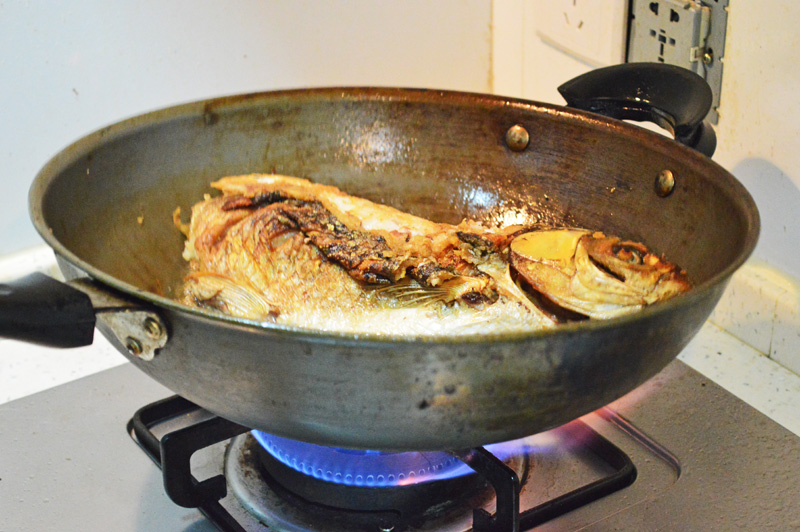 Recipe:  in a large wok enough to accommodate the fish, heat the oil on a high flame. The oil should start smoking, then add in your fish and cook both sides until almost done.