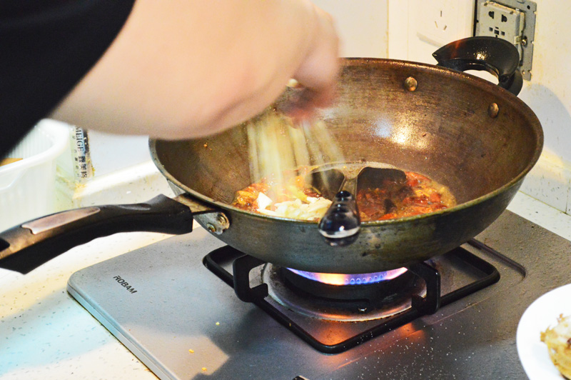 DSC_0129 Mr. Ye added a big of glug of ‘baijiu’ which is a Chinese alcohol (it’s 51% alcohol), extremely strong and crazy. He told me Vodka would work just as well, and I believe a man who handles a wok on fire with such grace.