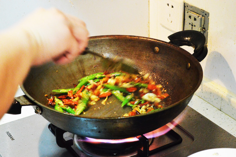 remove the fish on a plate and in the oil add the chillies followed by the water or chicken stock and let it heat. Add in the garlic, salt and chicken stock (if you are using water). Stir around and don’t let the heat drop, the wok should be fairly hot at all times. If the water evaporates add in more but keep enough to not let anything burn.