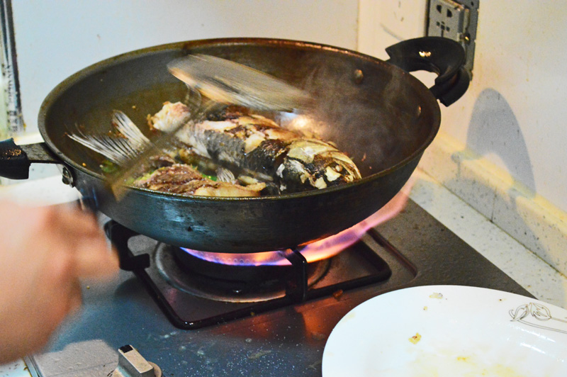 DSC_0112Cooked side up. All this was happening pretty fast though. The wok was being shaken, the fish being rotated, the sizzling and the smoke and the typically Chinese expertise in lifting the wok every some time from its extremely high flame.