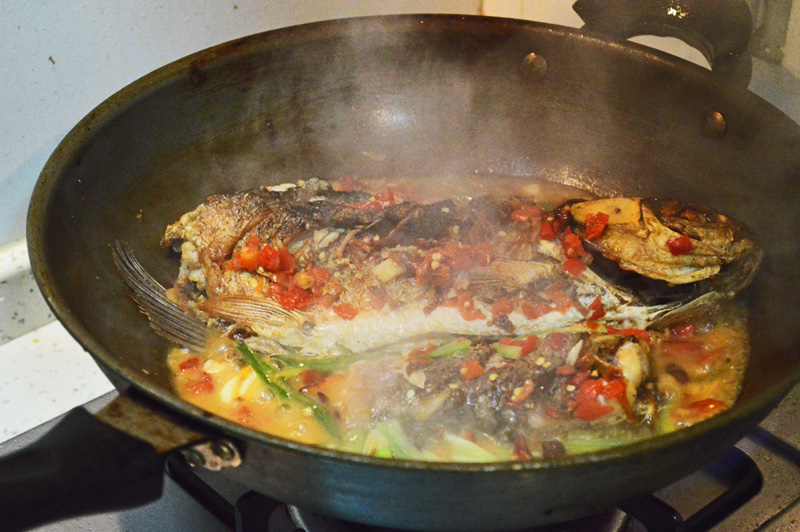 Put the fish you’d removed back into the wok, placing them atop the chillies and the thin coating of sauce.