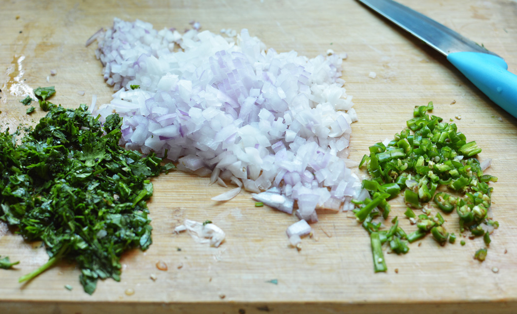 while you have someone going at the chickpeas in the processor, chop some onions, coriander and chillies to really fine pieces.