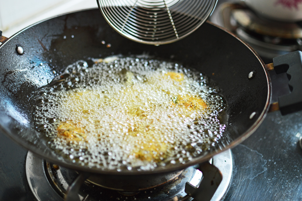 add the chopped onions, coriander, chillies to the mixture and mix well. You have to get in with your hands and mix. I couldn’t take pictures for the rest of the steps, because my hands were all sorts of covered in ummm.. stuff. Anyway, you mix well and form into flattish patties. In case you feel the mixture is too dry and not holding well together, add in about a tablespoon of flour and it will hold. You have to make sure that the patties form or else these will break while frying.