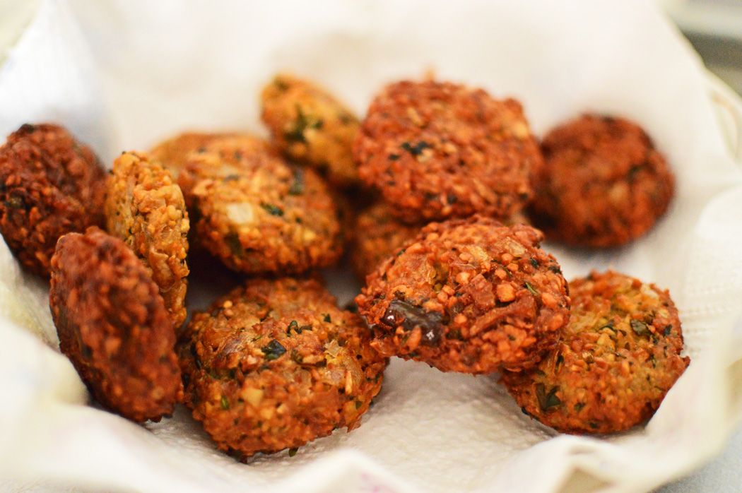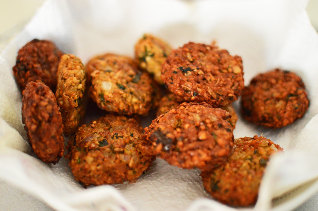 Recipe: Soak your chickpeas in cold water overnight. They should be swollen in the morning. Drain the water and wash them briefly. Chop them finely into very tiny nubbly bits in a food processor or chopper. DO NOT make in to a paste.