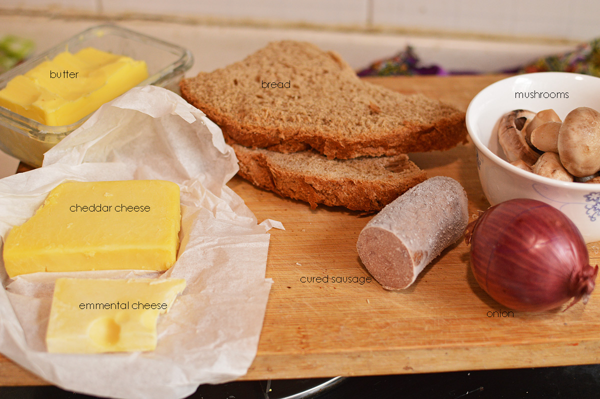 DSC_08922This is a pretty versatile affair. You can stuff it with whatever you want, but I did mine like so… butter, cheese (emmental & cheddar), cured sausage, onion, mushrooms & bread.