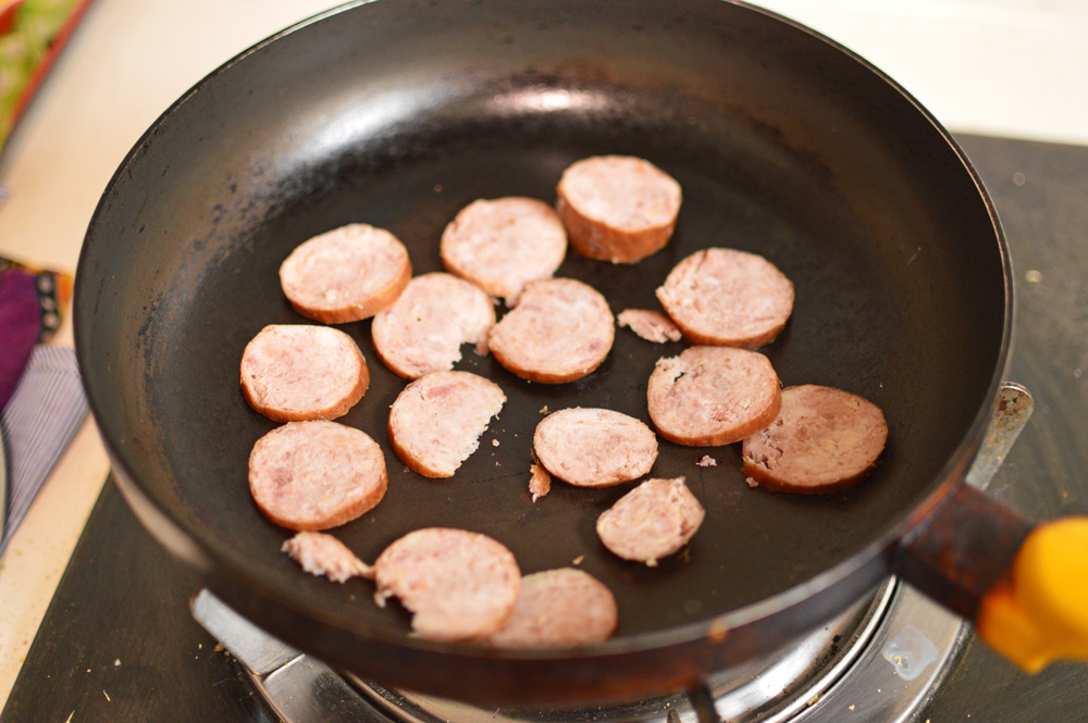 Recipe: dice the sausages into pieces and let them warm through on a hot skillet. Keep aside.