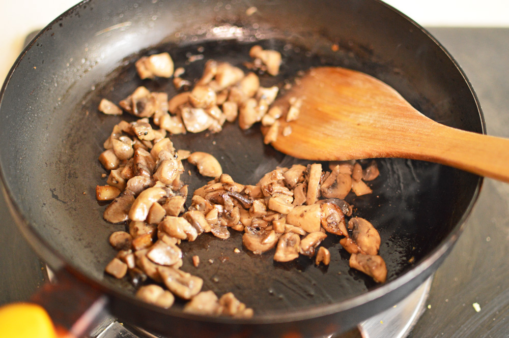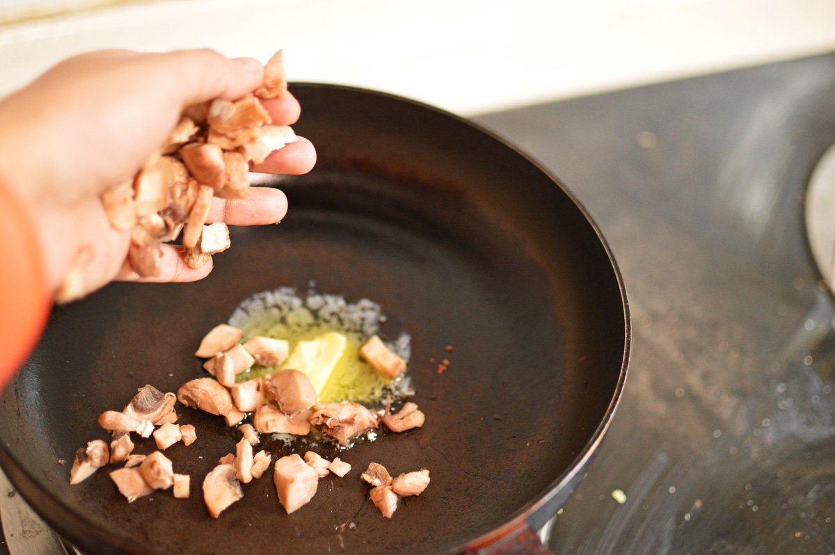 Melt one tablespoon of butter with some oil and add in the chopped mushrooms till they are cooked and their water has evaporated. Add in the chopped onions and pepper and salt and cook for another minute. You don’t have to cook the onions completely.
