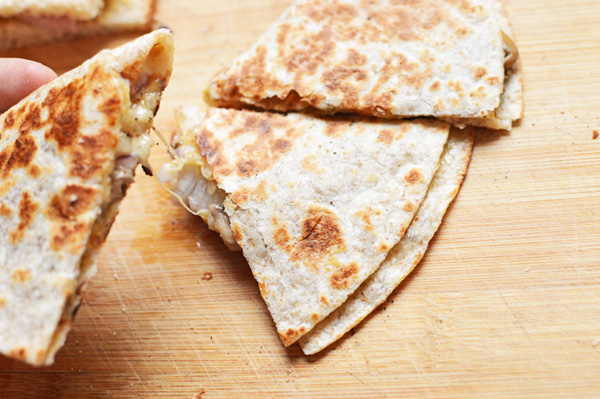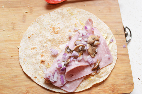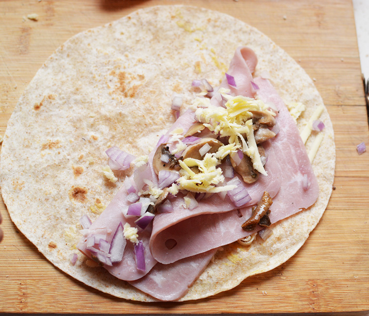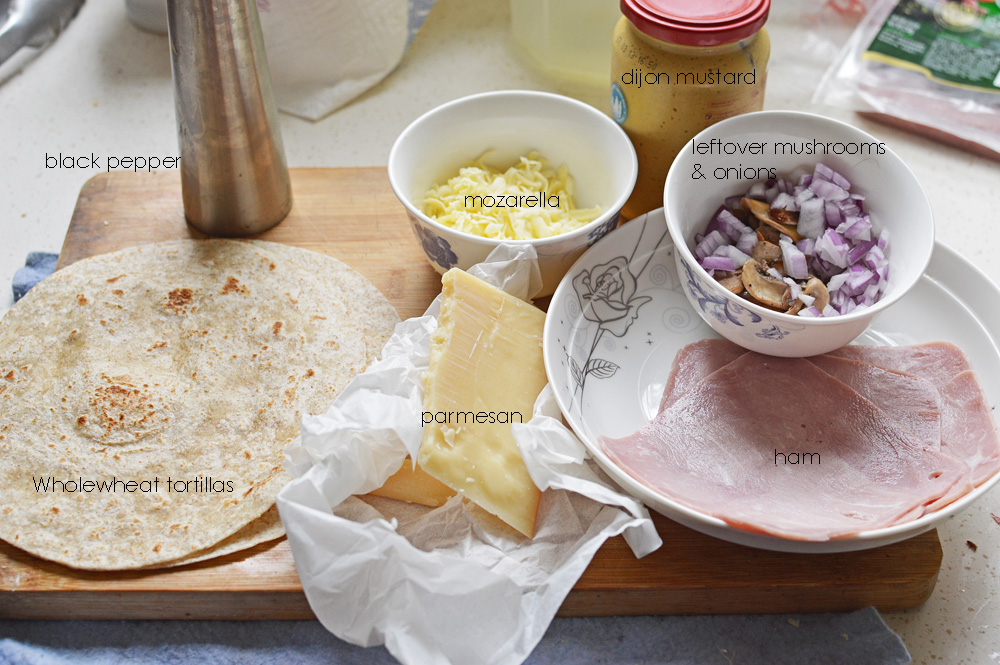 DSC_0678pwholewheat tortilla, pepper, mozzarella and parmesan cheese, ham, leftover sauteed mushrooms and some leftover chopped onions and dijon mustard.