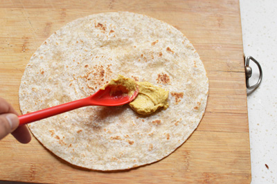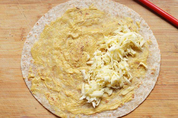How to: Lay out the tortilla and spread some mustard. On one side layer the cheese, the vegetables, sprinkle some pepper and add some more cheese. Fold to form half moon and transfer on a hot pan to brown and melt the cheese. Cut into 3 wedges and serve.