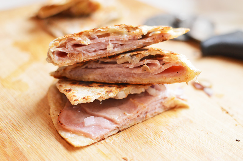 Repeat the same steps and add ham either cut into thinner strips or just as whole slices. If you wish you can add the remaining vegetables and transfer on a hot pan to let cheese melt and tortillas brown and crisp.