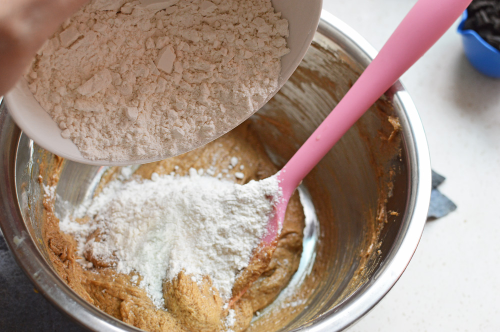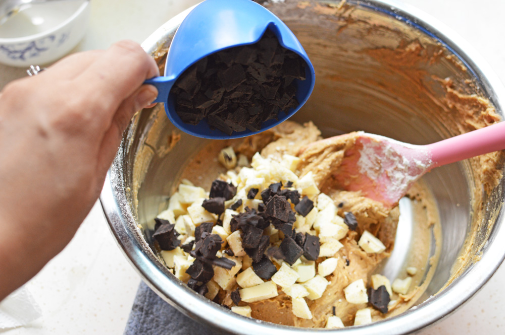 Add in the flour mixture and mix until just combined. Tumble in the chocolate chunks and stir again until all chunks are just incorporated into the mixture.