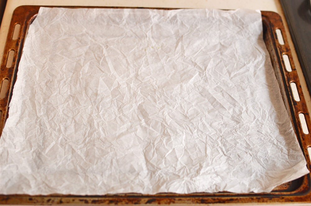 in the meantime, line your baking tray with parchment or butter paper, ignore that this is full of creases.