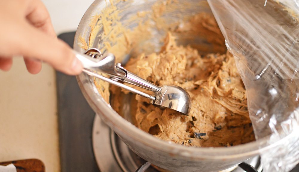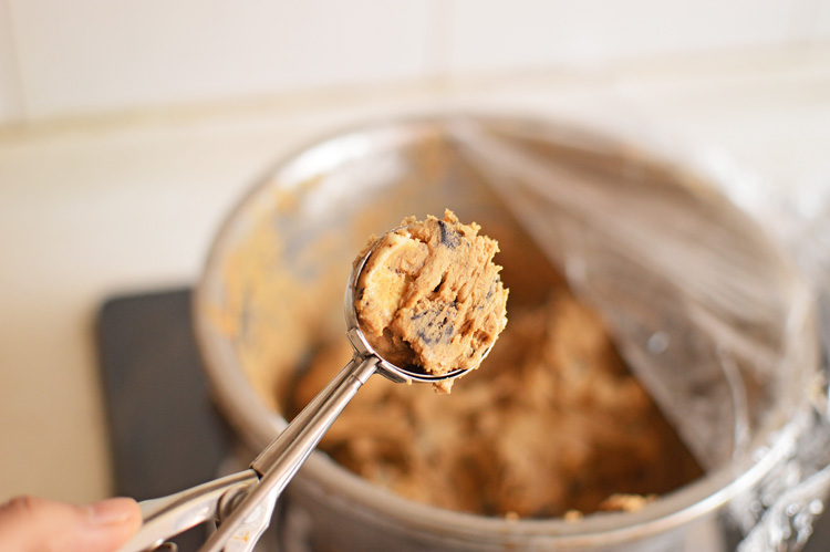 layer your baking tray with parchment paper, and using an ice cream scoop place them at least an inch apart, since these cookies will spread.