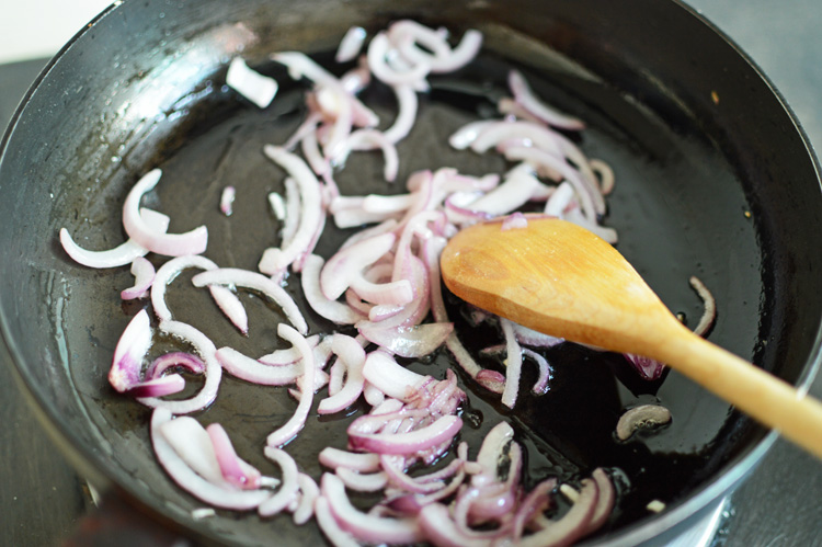 DSC_0348in the meantime, let’s get cracking with the onions.Β a frying pan on medium heat and a tablespoon of regular olive oil, just to get the onions sweating.