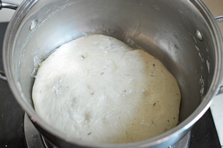 In a large bowl mix flour, rosemary and salt. Once the yeast water has foamed, add into the mix along with half the quantity of extra virgin olive oil. Knead to form a smooth dough (if the dough is too dry add more water, if it’s sticky add some flour)Β and let it rise for at least an hour or until it’s doubled in size.