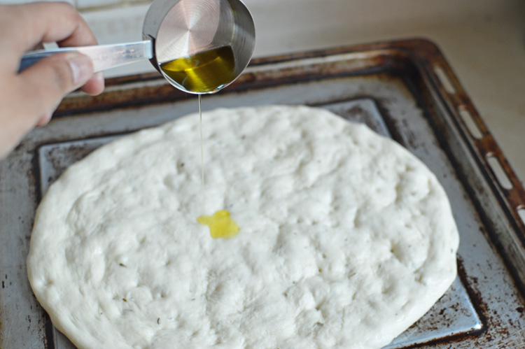 Once the dough has risen, knead it for another two minutes and flatten out on a well oiled tray (use a tablespoon of the remaining oil), making dimples with your fingers and add some more oil to the top.