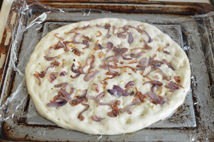 Spread the cooked onions on the top evenly and push them in so they stick. Wrap and let rest and rise for another 45 minutes.