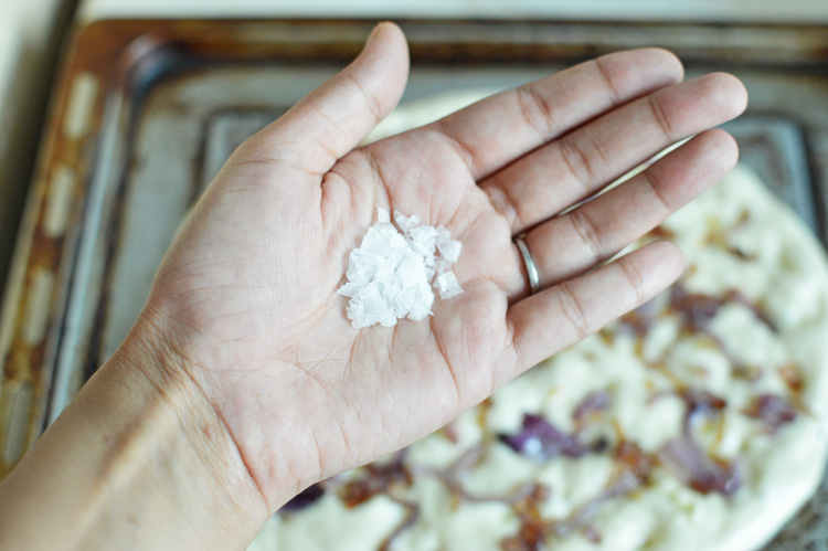 DSC_0373It’s risen a bit more after the second rising, and you’ve to simply sprinkle the salt on top and bake at 200℃ for 30-35 minutes, or until the top is nicely browned and the onions caramelized to a devious crispy dark