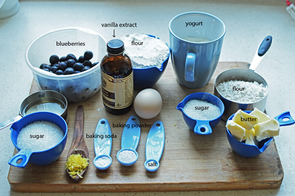 totally basic ingredients involving sugar, oil, lemon zest, baking soda, baking powder, salt, blueberries (obviously), yogurt, egg, vanilla extract, flour and crumble toppings that include flour, sugar & butter.
