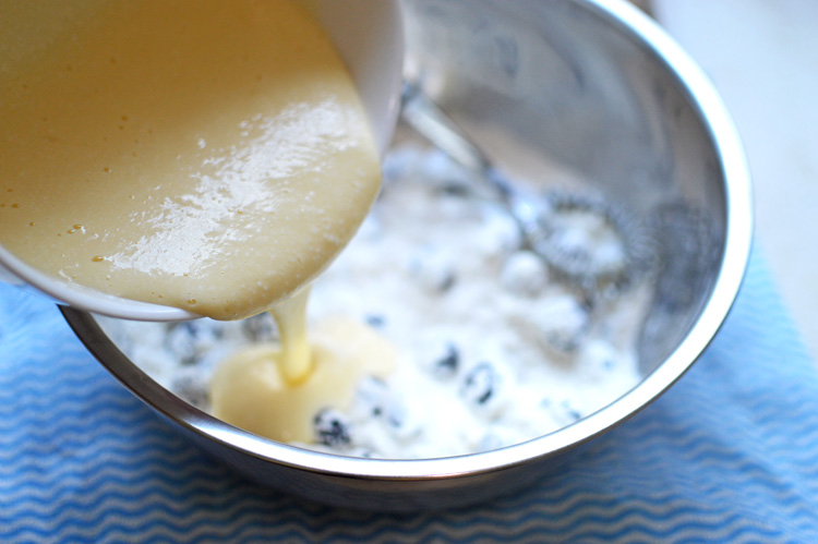 dry ingredients: In a separate bowl mix in the flour, sugar, baking powder, baking soda, salt, lemon zest and blueberries. Mix until the blueberries are well coated with flour and all the ingredients are evenly mixed.