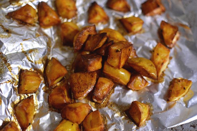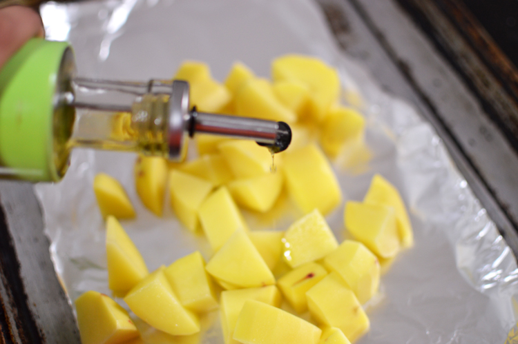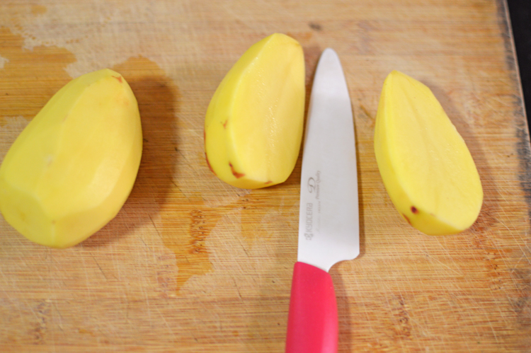 let’s prep the potatoes first, since they will take the longest to bake. So peel ’em