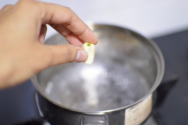 in the meanwhile as the potatoes bake, bring a pot of water to boil, and add a clove of garlic