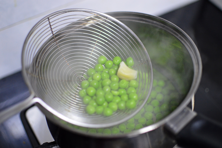 In a pot of boiling water add garlic and peas and cook until they’re tender. Blend into a nubbly puree.