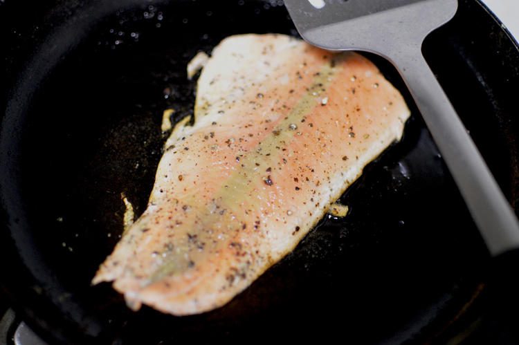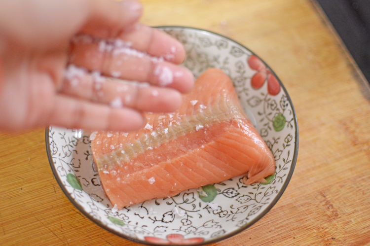 finally, salt and pepper on both sides of the fish. (I just have the salt one, but imagine there’s pepper in it too). Try and use a good salt if you can. I’m using Maldon salt.