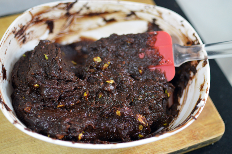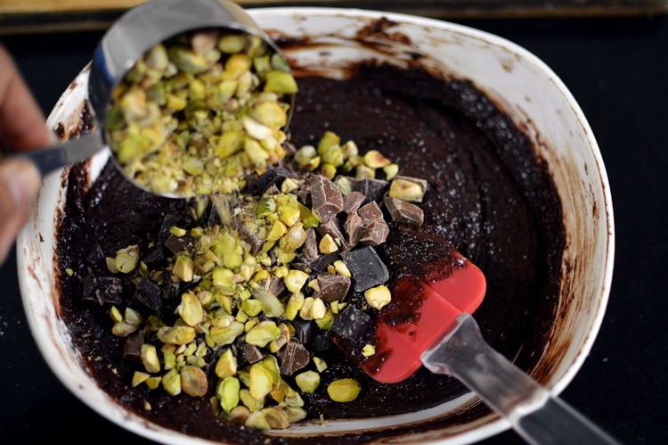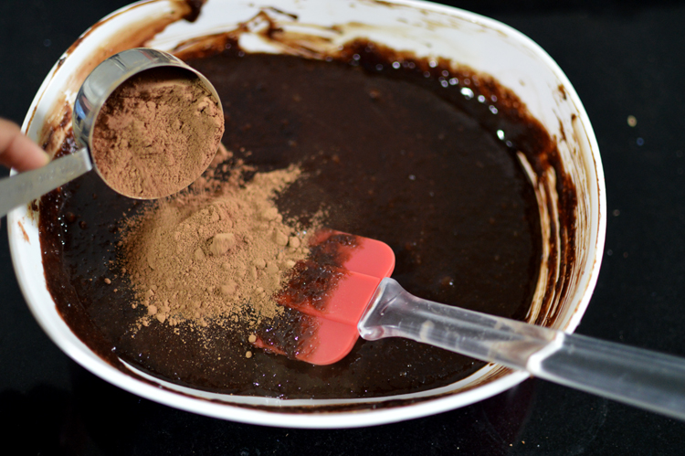 Add in the vanilla extract, cocoa powder, flour, chocolate chunks and salted nuts. Mix until well incorporated.