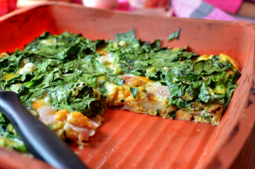 Layer the potato, ham, cheese and spinach in a baking pan. Pour over the eggs and bake at 190°C for 15-20 minutes until the sides have nicely puffed and the eggs have cooked through. Let rest for 5 minutes before cutting into portions.