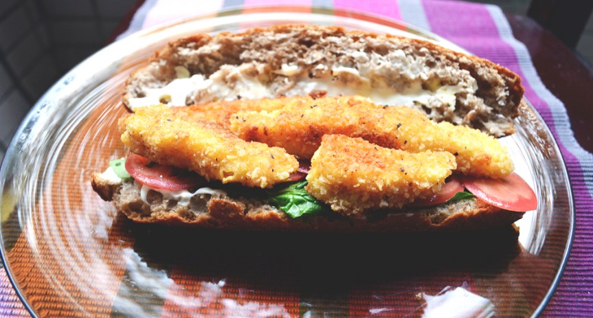layer on them fried fish fingers and voila! You have the most fabulous fish sandwich ever. It’s absolutely out of the world. Crunchy, filling with the distinct flavours of a well cooked fish encased in crispy crumbs entombed in buttery bread with all the fixings. This makes for such a lovely meal that you’d be left reminiscing this moment during your darkest hours. I speak from experience.