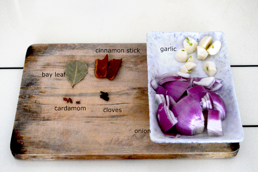 To make onion gravy, which is really the base of this curry we need a bay leaf, a cinnamon stick, some cardamom seeds sans green shell, a few cloves, some garlic and onions which will go into a blender to get a smooth spice enriched onion paste.