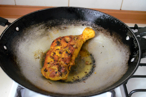To make the curry, add some oil to a wok or pan of choice and let it come to near smoking, after which add the now marinated chicken and let sear boldly on one side until deliciously bronzed before turning.
